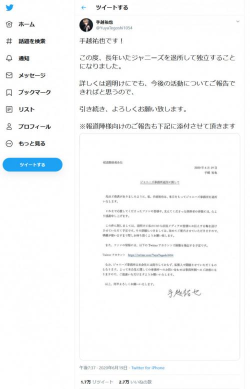 画像 即twitter開設 手越祐也さんジャニーズ事務所と契約終了に