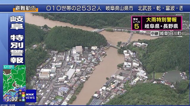飛騨川氾濫 岐阜の白川町が浸水 冠水 現地の動画や画像など 下流の